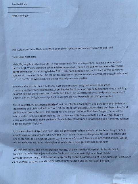 ich hoffe, es geht euch allen gut! Ich wollte heute ein Thema ansprechen, das mir etwas auf dem Herzen liegt. Wie ihr vielleicht schon mitbekommen habt, haben wir seit Kurzem einen Nachbarn Bernd Ulrich, der sich als Mitglied der AfD zu erkennen gegeben hat. Ja, ihr habt richtig gehört es handelt sich um eine Partei, die oft mit rechtsextremistischen Ansichten in Verbindung gebracht wird. Und ich dachte, es wäre klug, ein kleines Warnsignal auszusenden.