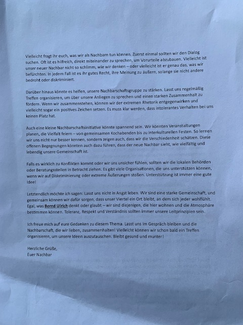 Ich habe auch mit einigen von euch über die Dinge gesprochen, die wir beobachten. Einige haben erzählt, dass sie sich unwohl fühlen, wenn sie an seinem Haus vorbeigehen. Das ist wirklich traurig und sollte nicht so sein. Unser Viertel war immer ein Ort der Toleranz und des Miteinanders. Lassen wir uns nicht von extremen Ideologien einschüchtern oder gar auseinanderbringen!