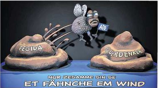 Die Botschaft ist klar: Pegida ist Sche…e , die Querdenker sind Sche…e und die AfD-Anhänger sind die Schmeißfliegen, die zwischen den Kothaufen umherschwirren. Erinnern wir uns: PEGIDA, ein Akronym für Patriotische Europäer Gegen die Islamisierung des Abendlandes. Und die Querdenkerbewegung wurde durch Juristen, Ärzte, Künstler und viele kritisch-besorgte Bürger gegründet, welche die Außerkraftsetzung unserer Grundrechte unter dem Vorwand der Gesundheitsfürsorge nicht widerspruchslos hinnehmen wollten. Klar, die Regierungsparteien und das mit ihr verbandelte rot-grüne Medienspektrum finden diese Art der freien Meinungsäußerung ganz einfach Sche…e. Besonders nachdenklich macht mich die Darstellung der braunen Schmeißfliege: Da werden Menschengruppen als ekelerregende Schadinsekten verunglimpft. Das hatte in Deutschland eine ungute Tradition.