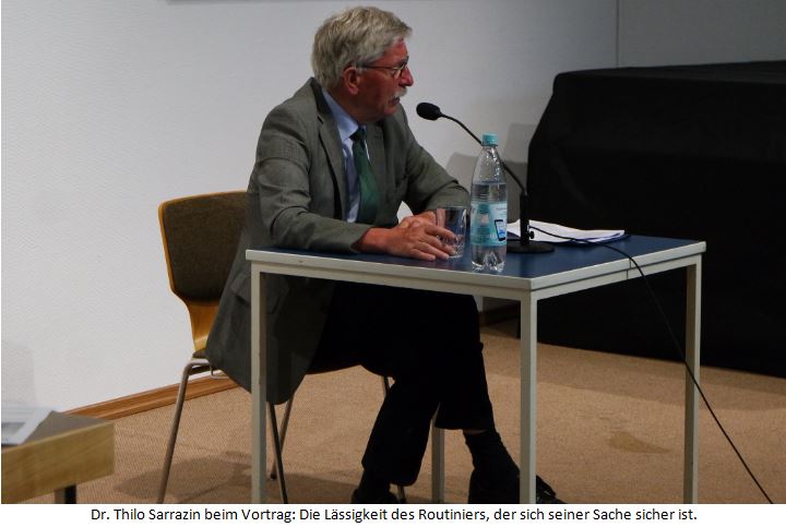 Einschub: Mir war es eine besondere Freude, Thilo Sarrazin nun von Angesicht zu Angesicht persönlich begrüßen zu dürfen. Unser erster Kontakt datierte zurück auf das Jahr  2012. Gegenstand war seinerzeit ein Briefwechsel über einen Gastartikel in der Wochenzeitung „WELT“.  In seinen Werk „Tugendterror“, erschienen 2013, nahm Thilo Sarrazin auf diese Episode Bezug.