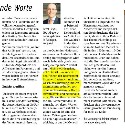 Unser hiesiger CDU-Abgeordnete, der promovierter Parlamentarier Peter Beyer steckt in einem Dilemma: Er muß regelmäßig eine Kolumne im hiesigen Anzeigeblättchen „Dumeklemmer“ bedienen. Diese kostenlos an Ratinger Haushalte verteilte Wochenzeitung möchte nämlich neben Bekanntschaftsanzeigen, Gebrauchtwageninseraten und sonstigen Sonderangeboten ihrer Leserschaft auch redaktionelle Inhalte bieten. Peter Beyer nutzt dieses Forum gerne als Selbstdarstellungsplattform. Was aber tun, wenn man über das gegenwärtige Groko-Gerangel am liebsten den Mantel des Schweigens legt?