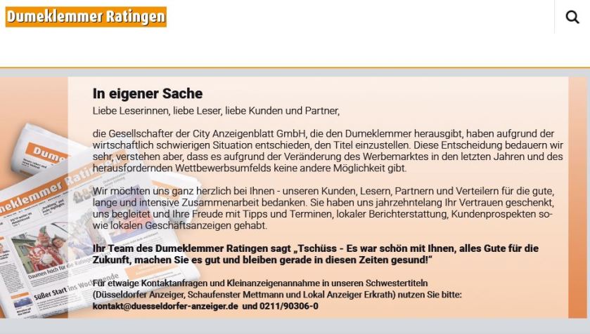 Ich habe es erst gar nicht gemerkt: Er kam einfach nicht mehr. Dann habe ich mich selber auf die Suche gemacht: Er ist still und friedlich eingeschlafen. Keine Pressemeldung, keine Traueranzeige, kein Nachruf, nichts, gar nichts. Nur im Internet die lapidare Mitteilung unter https://www.dumeklemmer-ratingen.de/