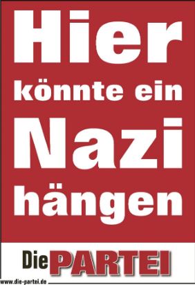 Zwar versuchten sie später den öffentlichen Mordaufruf zu relativieren. So wollte  mich ein den Nazi-Jägern geneigter Kommentator mit dem Künstlernamen „Konrad Duden“ belehren: „Dies ist ein Satz aus einem Subjekt („Nazis“) und einem Prädikat („töten“). Man nennt dies einen einfachen Aussagesatz. Erst mit dem „!“ würde daraus ein Imperativ.“ Okay, dann schauen wir uns doch mal das nächste Plakat an: „Hier könnte ein Nazi hängen“.